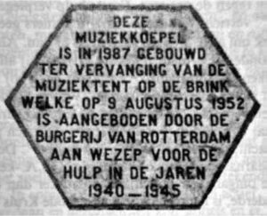 Foto 2: De plaquette uit 1987, deze brak bij de sloop van de tweede muziektent en vormt nu de basis voor het kunstwerk uit 2025.