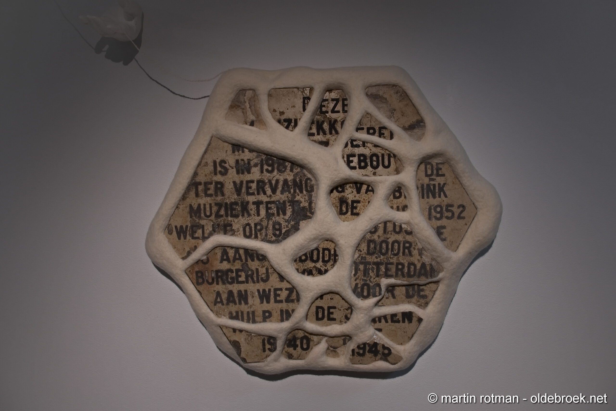 Foto 2: De plaquette uit 1987, deze brak bij de sloop van de tweede muziektent en vormt nu de basis voor het kunstwerk uit 2025.